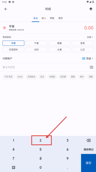 2、在明细录入页面,选择早餐分类,输入消费金额223。