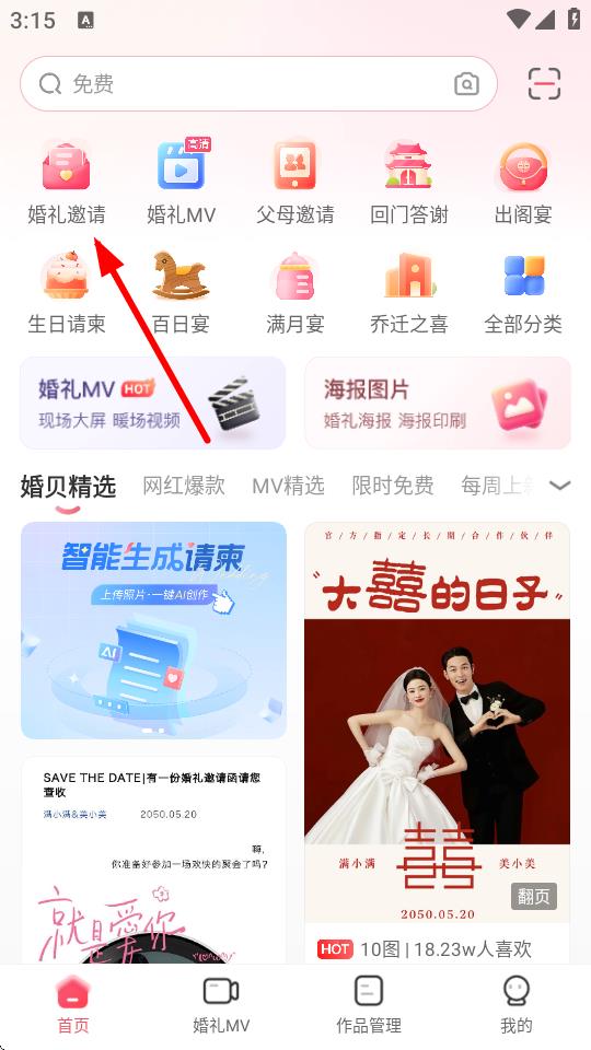1、打开婚贝请柬App,在首页点击婚礼邀请选项。