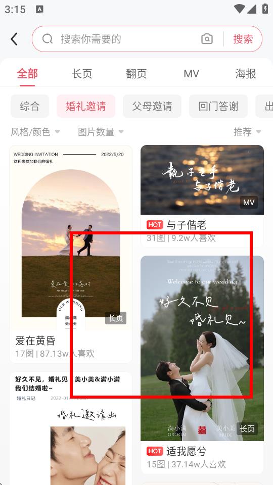 2、进入婚礼邀请模板页面后,浏览并选择自己喜欢的请柬模板,比如长页、翻页、MV或海报类型的模板。