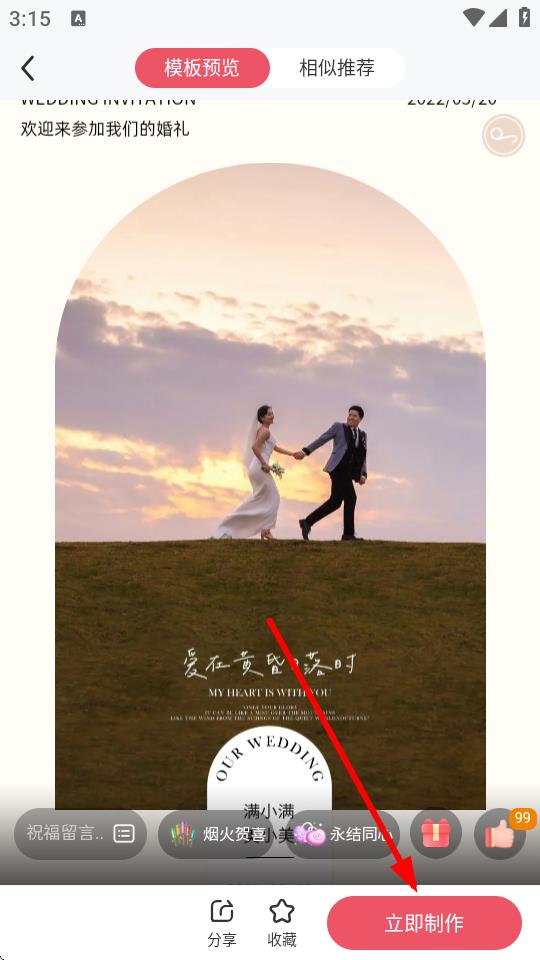 3、点击选中的模板进入模板预览界面,确认是想要的风格后,点击底部的立即制作按钮。