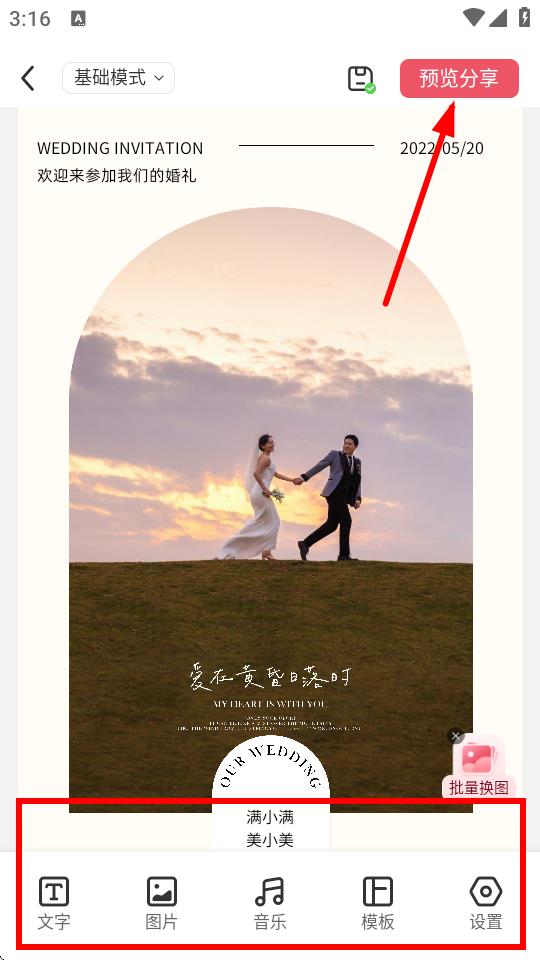 4、进入制作界面,利用底部的功能,对请柬内容进行个性化编辑完成编辑后,点击预览分享即可分享。