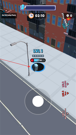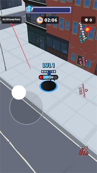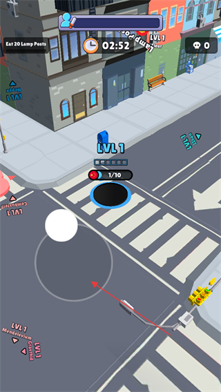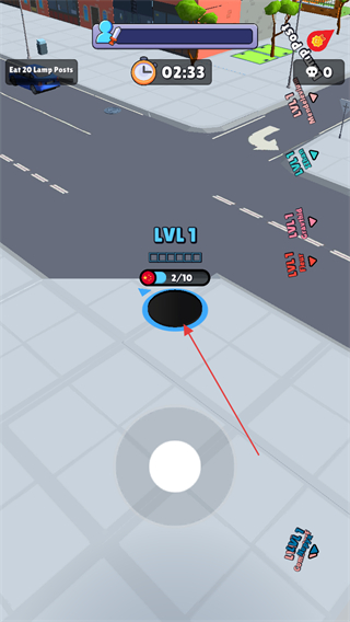 2、前期黑洞较小时,优先吞噬如交通锥、垃圾桶等小型物体,提升等级,屏幕中间显示当前等级LVL1和吞噬进度1/10。