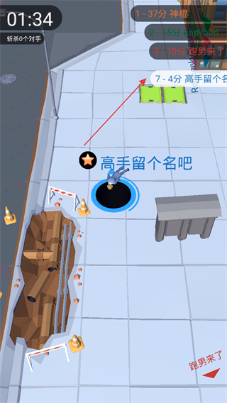 2、屏幕左侧显示斩杀0个对手,去街道、广场等区域,吞噬行人、小型障碍物,增大黑洞体积。