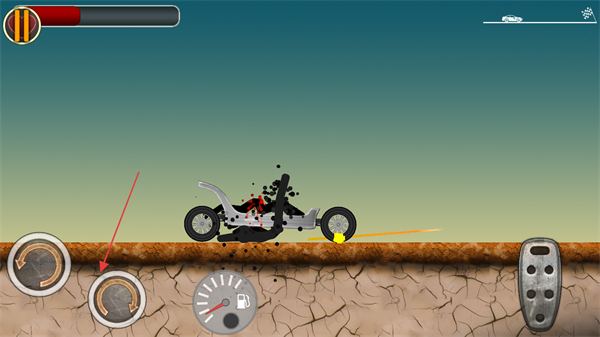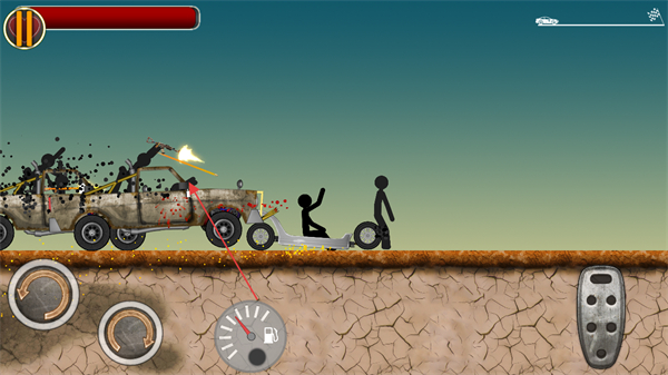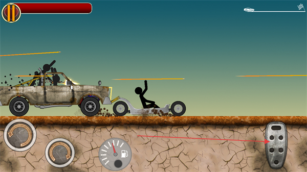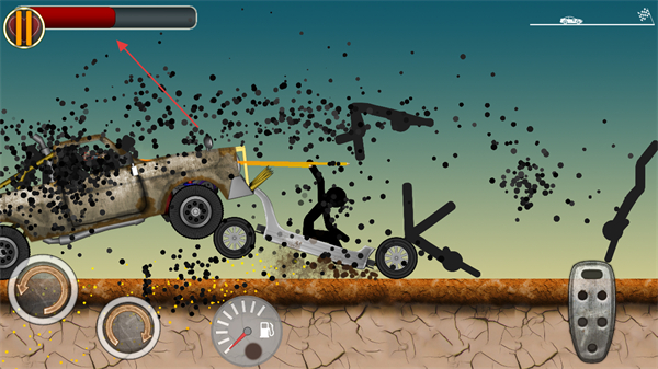 1、进入游戏界面,利用屏幕右侧按钮操控火柴人驾驶的车辆,注意观察上方血条。