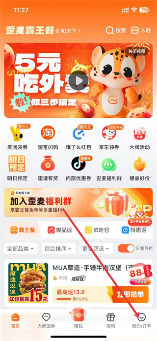 1、打开歪麦霸王餐,点击导航栏我的/订单选项。