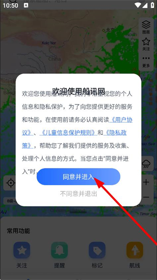 1、弹出的欢迎使用船讯网提示框中,点击同意并进入,即可进入软件。