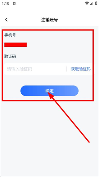 4、输入手机号,获取并输入验证码后,点击确定,完成账号注销操作。