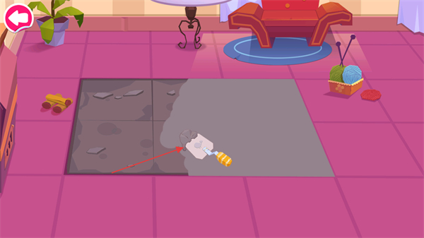 1、进入游戏场景,操控角色糖糖,看到房屋内有需要修理的地方,比如破损的地板,点击开始修理任务。