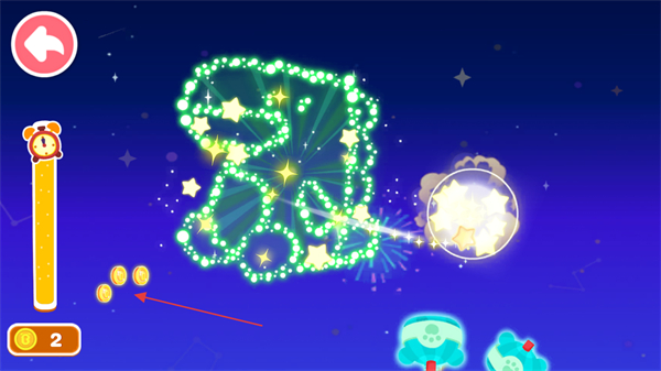2、成功击中球体后,球体会绽放出绚丽的光影效果,同时会掉落金币,记得收集左侧的金币,金币数量显示在左下方如1。