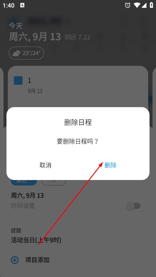 4、在弹出的删除日程确认窗口中,点击删除选项,即可成功删除该事件。