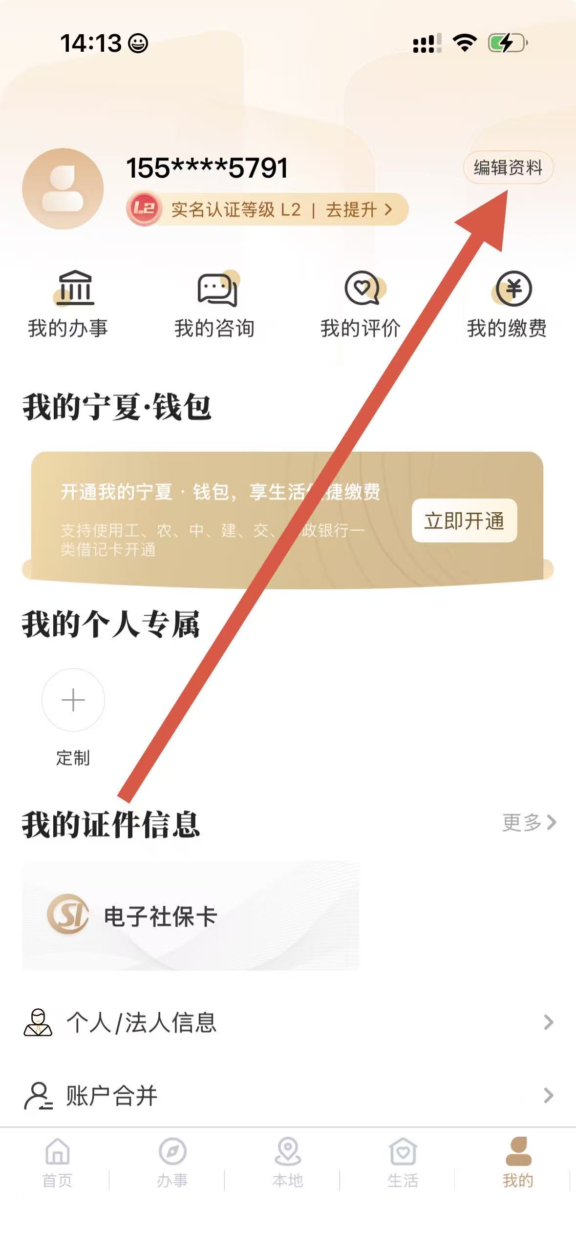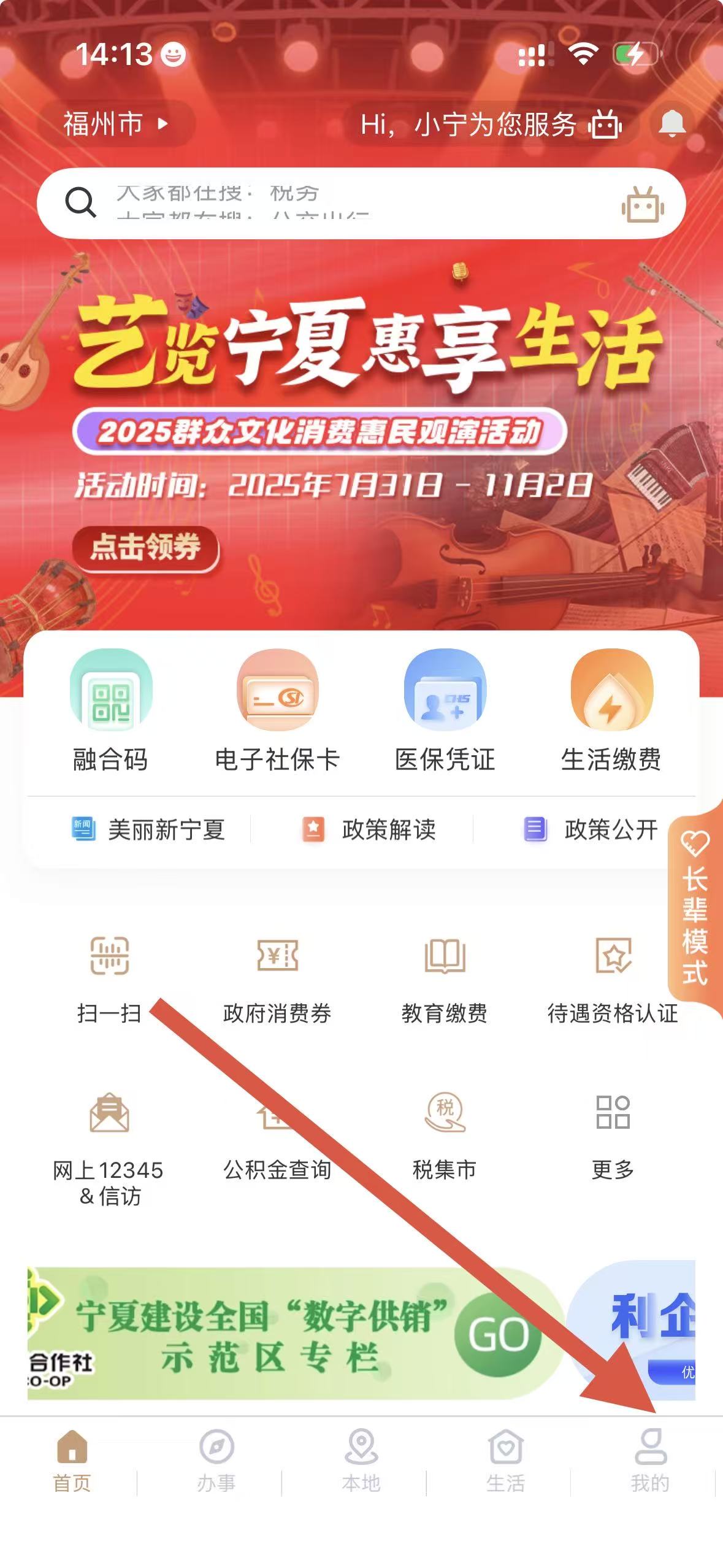1、打开我的宁夏APP,在首页点击底部导航栏中的我的,进入个人页面。