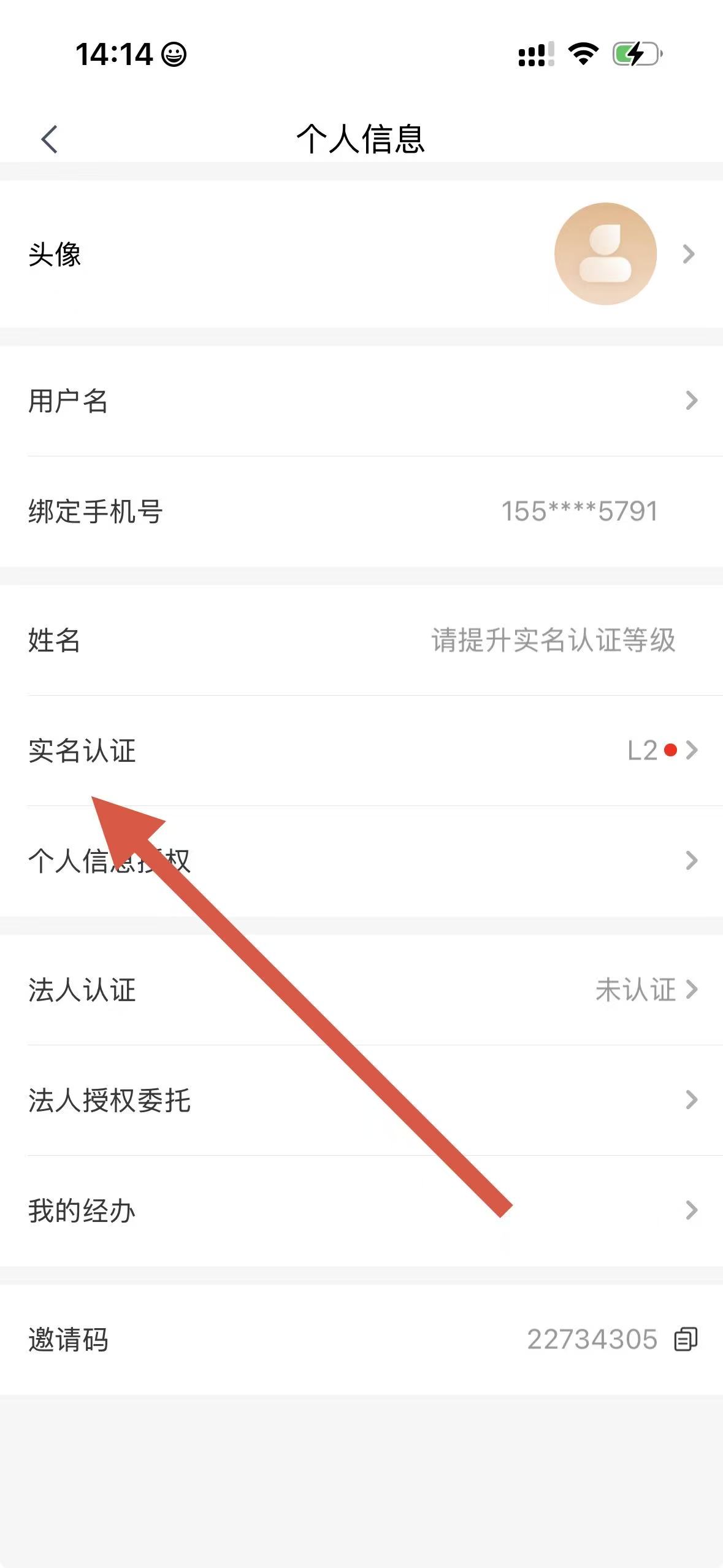 3、在个人信息界面里,找到并点击实名认证选项,进入实名认证页面。