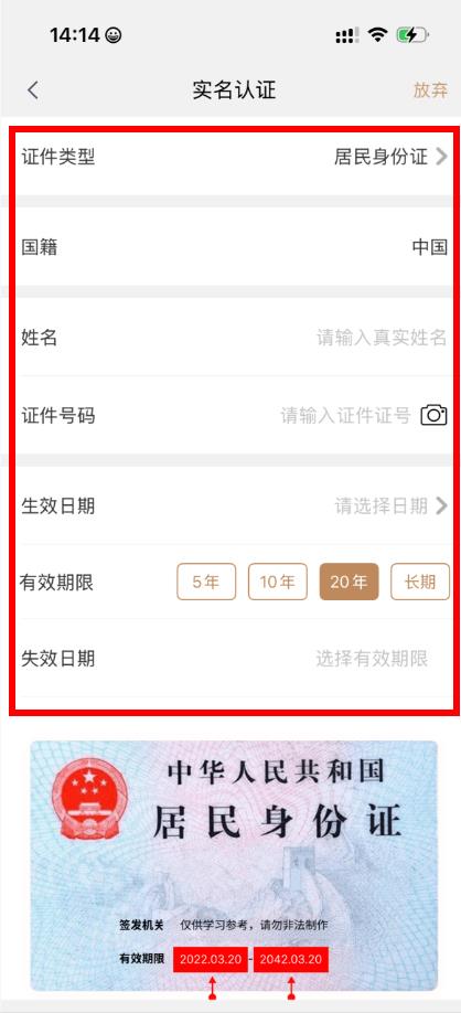 4、在实名认证页面,选择证件类型如居民身份证,并填写相关信息。