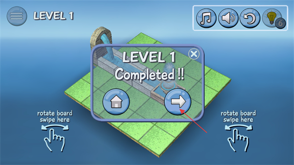 4、成功将水流引导至喷泉,出现LEVEL1Completed!提示后,点击箭头图标进入下一关。