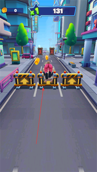 1、游戏开始操控角色跑酷,看到前方路障及时躲避,同时注意收集路上金币增加分数。