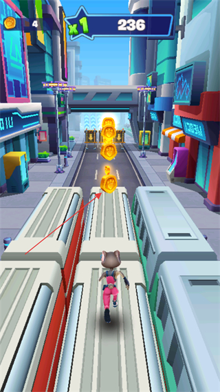 2、在跑酷过程中,紧盯前方空中排列的金币,调整角色位置将其收入囊中提高得分。