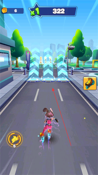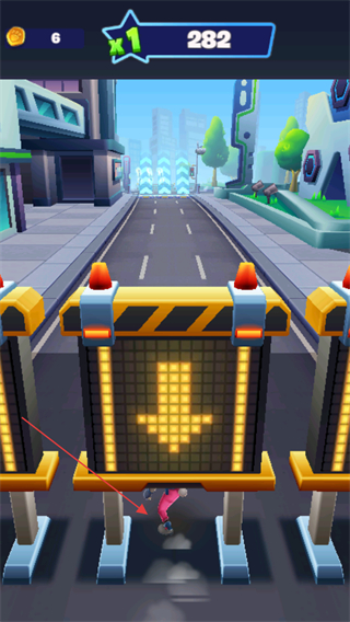 3、遇到带有向下箭头标志的路障时,快速操作角色下蹲,顺利通过避免碰撞。