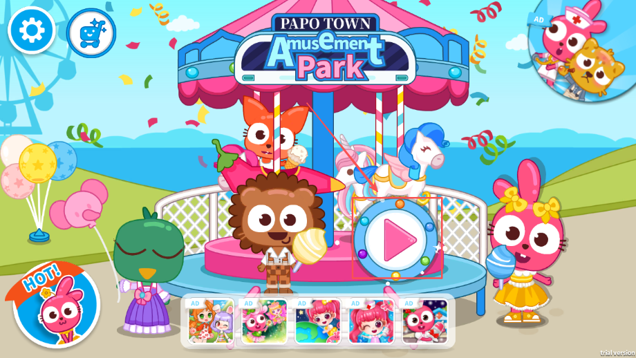 1、打开游戏点击旋转木马按钮开始游乐园欢乐体验,选择喜欢的游乐设施进入玩耍,探索各种有趣的项目。