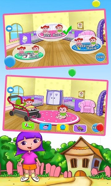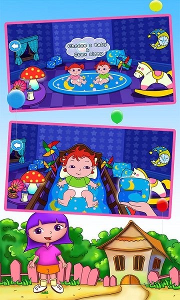 6、婴儿房——在婴儿房中,小朋友可以选择自己喜爱的被子给双胞胎姐弟俩盖被子,当然还少不了一首摇篮曲,这样能让婴儿更快的进入睡眠,沉浸在音乐中进入梦境。