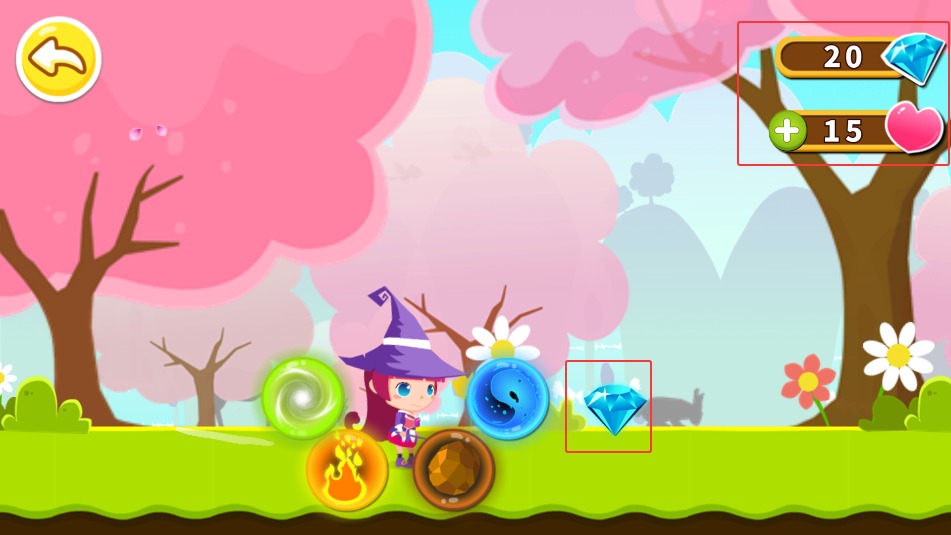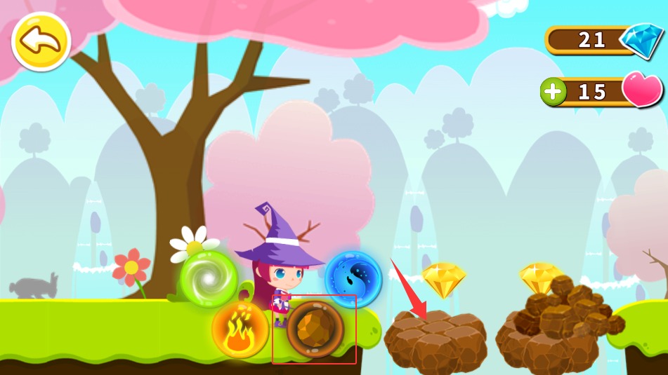 1、魔法技能施放操作,通过点击选择相应元素魔法,在合适位置施放技能改变场景结构,例如使用风魔法推动风车产生动力。