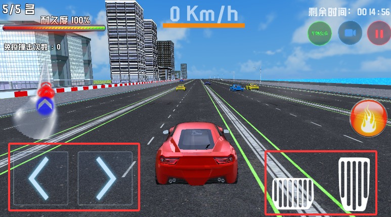 3、通过左侧按键控制行驶左右方向,右侧油门刹车键负责加速与倒车操作。