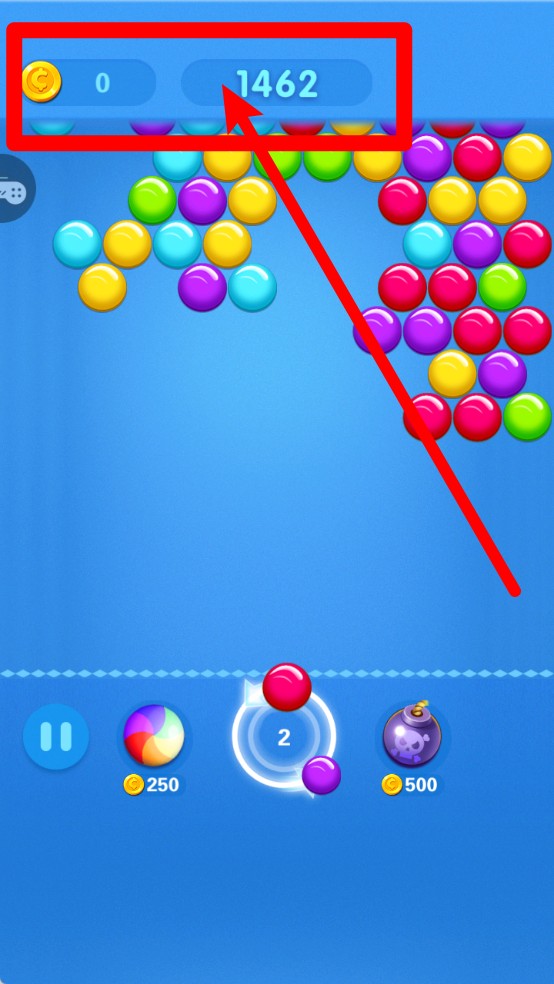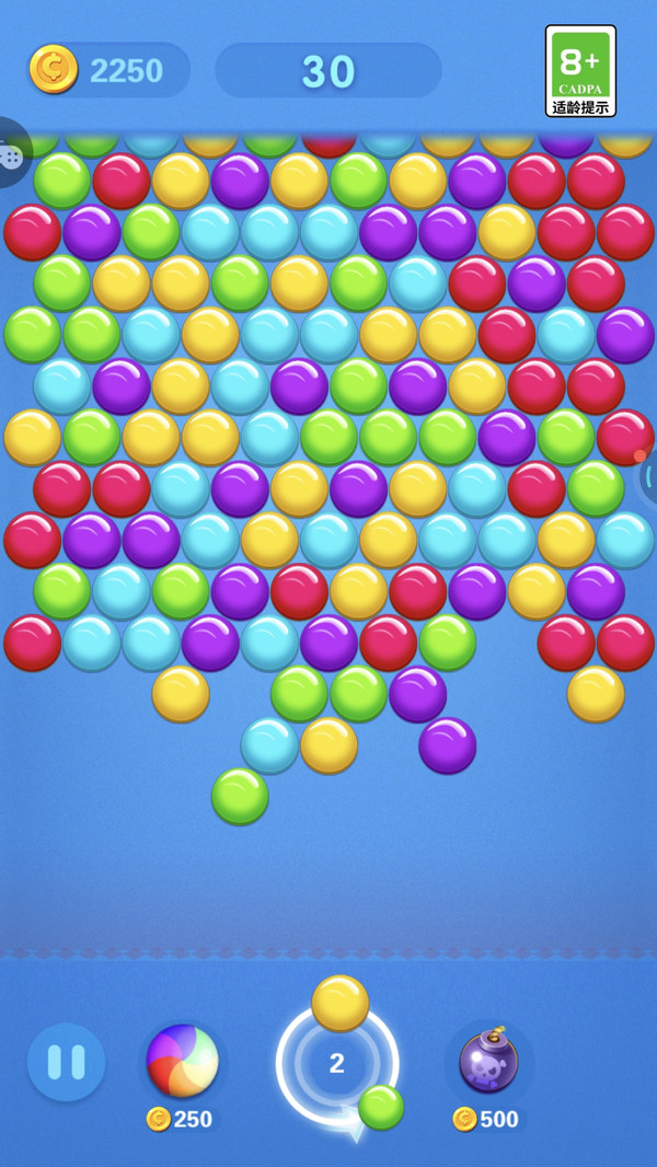 2.道具辅助:多样化的辅助道具在下方展示,包括彩虹球和炸弹球,能帮助玩家顺利消除复杂泡泡布局,增加通关几率。