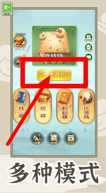 1.多样模式选择:进入大厅可见残局、揭棋、翻翻棋和比赛场等模式,玩家点击快速开始即可直接进入对局,畅享象棋乐趣。