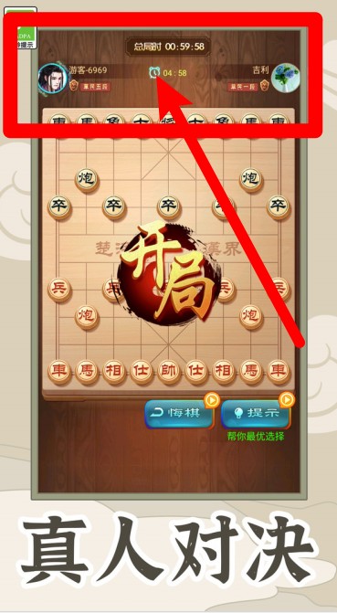 2.真人实时对战:对局画面显示双方头像和倒计时,棋局紧张激烈,玩家需要快速思考走法,展现即时反应与智慧。