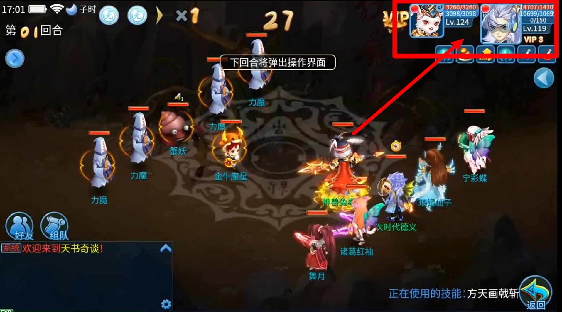 1.战斗界面左上方清晰显示角色头像、等级以及生命值和法力值,玩家能随时掌握队伍状态,合理安排技能释放。