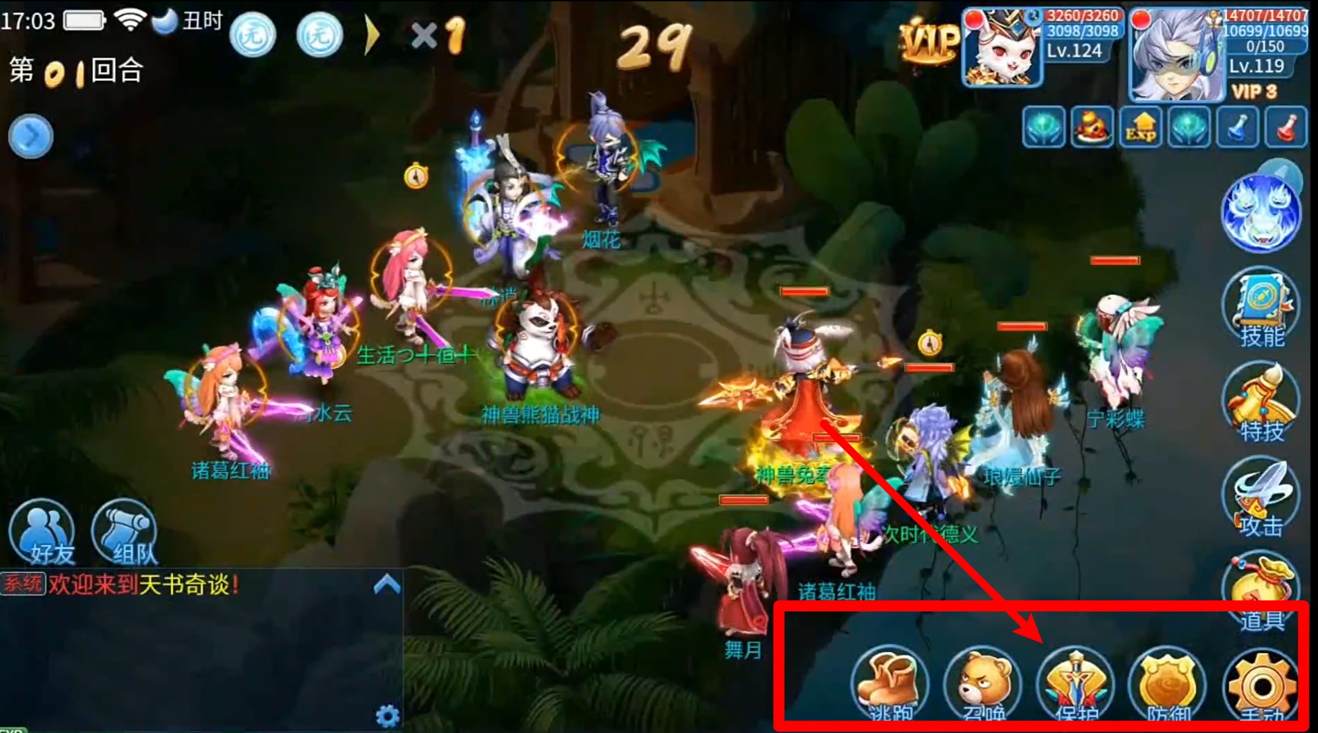 2.界面操作直观清晰,右下方可使用技能、特技、攻击等指令,点击召唤或保护功能还能提升整体战斗策略性。