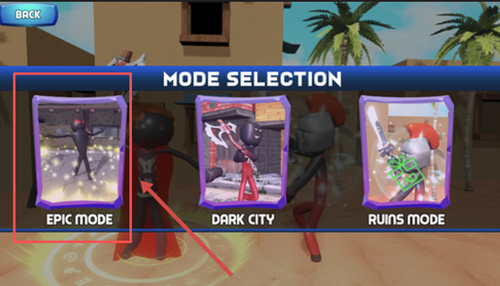 2、在模式列表中选择EPICMODE、DARKCITY或RUINSMODE等不同玩法,点击后进入对应战斗场景。