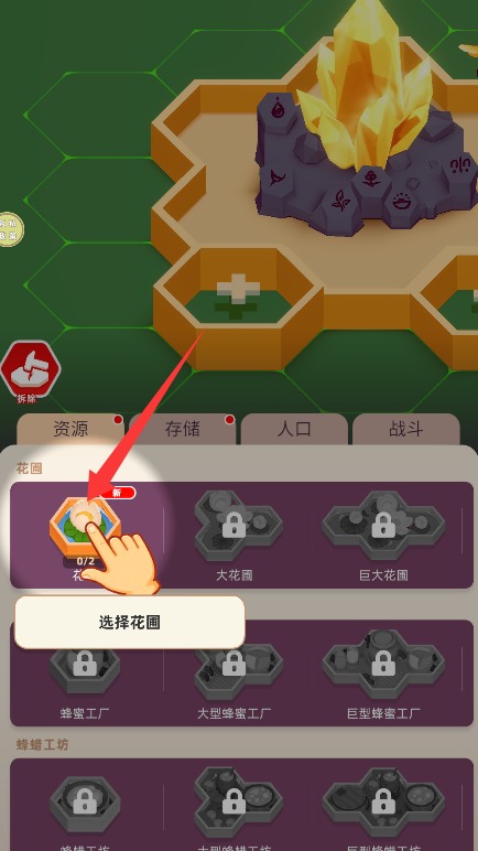 3、点击已建成的巢室可添加附属设施,选择花圃进行配套农业区域扩展建设。