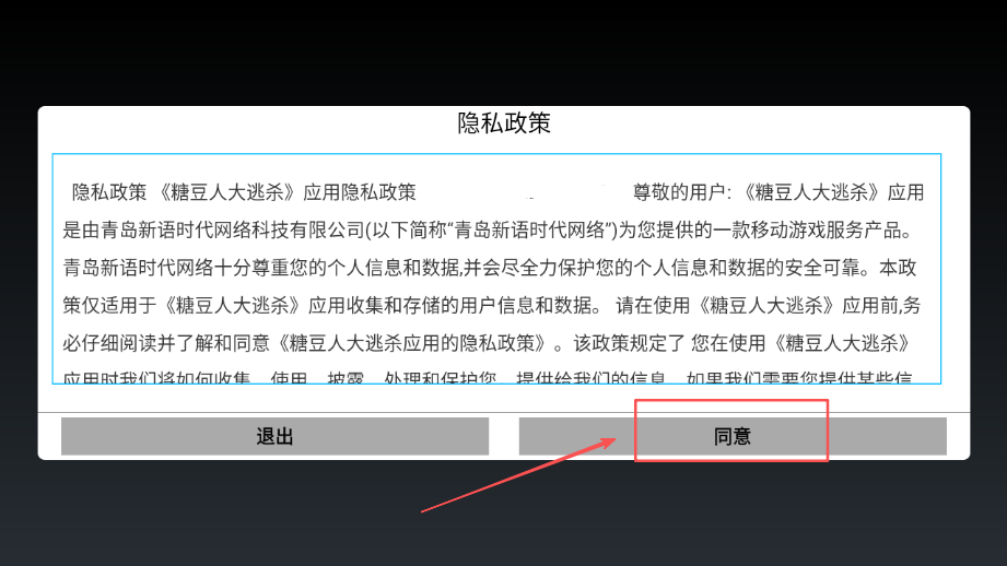1、打开糖豆人大逃杀后,首先会弹出游戏协议页面,在页面中找到同意选项并点击,完成协议确认后才能进入后续游戏环节。