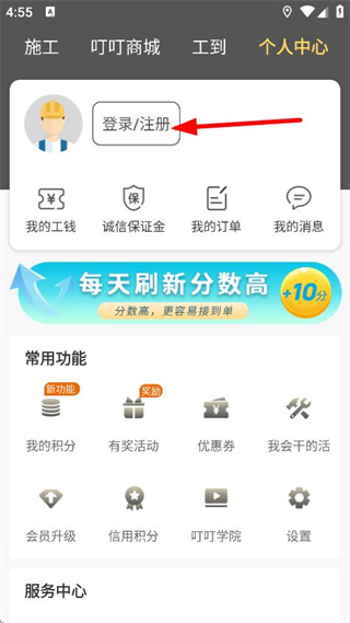 2、在个人中心页面,点击登录注册,进入登录注册界面。