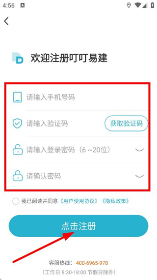 4、输入手机号码、验证码、登录密码并确认密码,点击注册,完成注册操作。