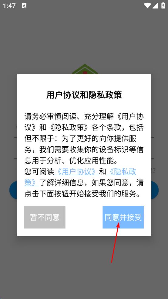 1、打开医疗类APP,会弹出用户协议和隐私政策页面,仔细阅读后点击同意并接受按钮。