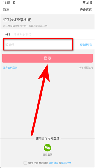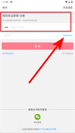 3、在短信验证登录注册页面,输入手机号后点击获取验证码。
