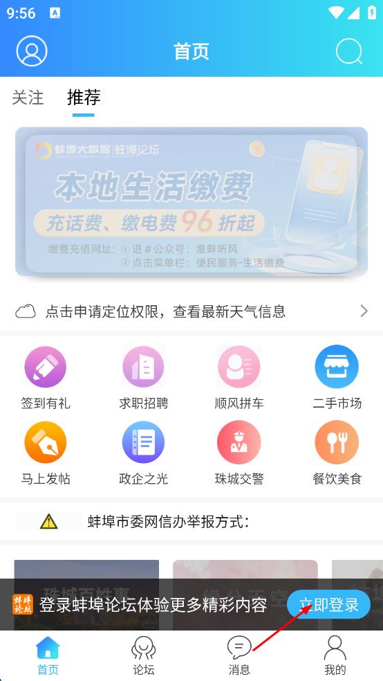 2、进入APP首页后,点击页面下方的“立即登录”按钮。