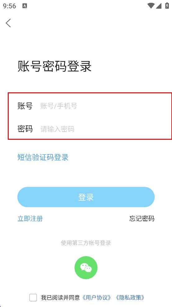 3、进入账号密码登录页面,在账号输入框中输入账号,在密码输入框中输入密码。