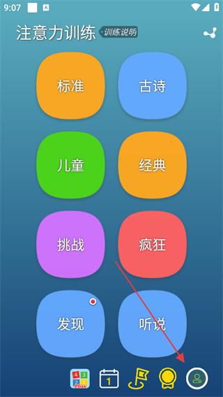 1、打开注意力训练APP,进入主界面后,点击底部导航栏最右侧的我的选项。