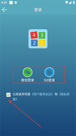 3、勾选已阅读并同意用户服务协议和隐私政策,选择微信登录或QQ登录。