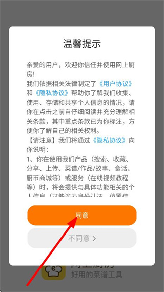 1、在温馨提示弹窗中,点击同意,进入主界面。