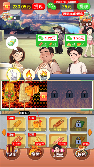 1、进入游戏,查看屏幕上方现金数额230.03元,了解提现条件,留意顾客消费金额提示,如1.22元。