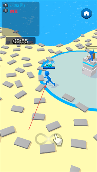 1、进入游戏,操控蓝色小人在沙滩场景中移动,点击砖块进行搬运,留意上方剩余时间02:55。