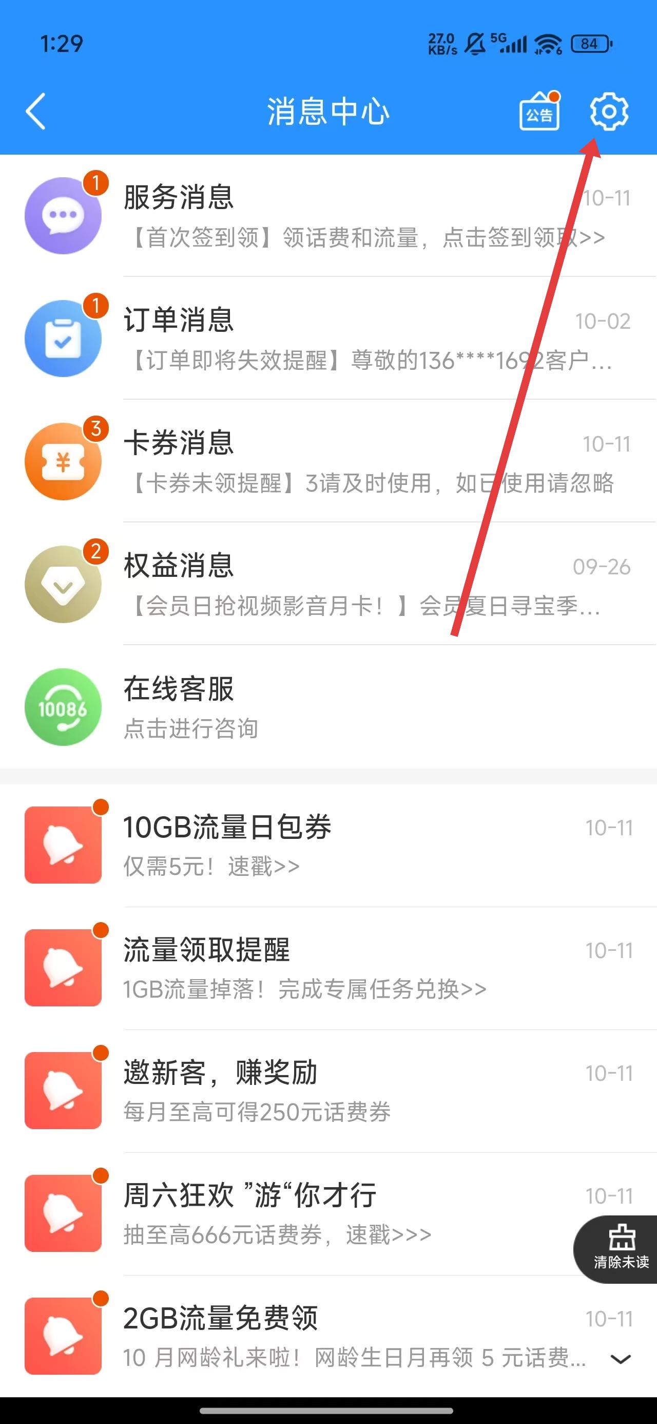3、在进入到消息中心页面后,若不想看到活动消息,可以点击右上方齿轮图标进行设置。