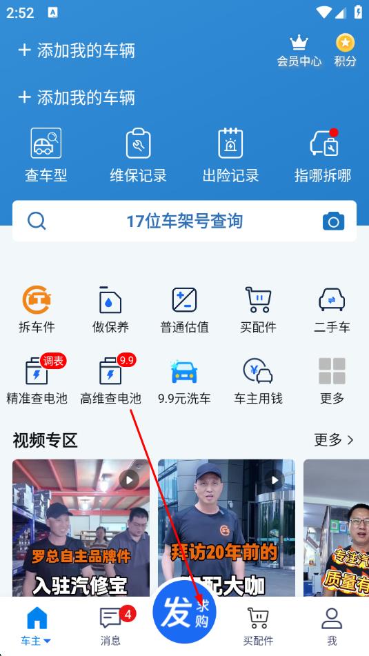 1、打开汽修宝应用,点击底部导航栏中间的发求购蓝色图标。
