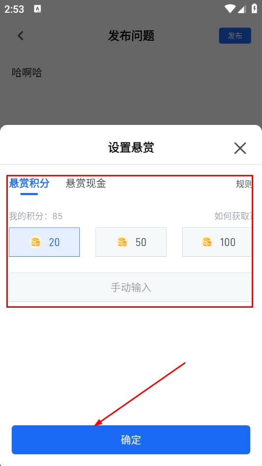 4、若想提高问题的关注度,可以设置悬赏,选择悬赏积分的数量,点击确定,即可完成提问。