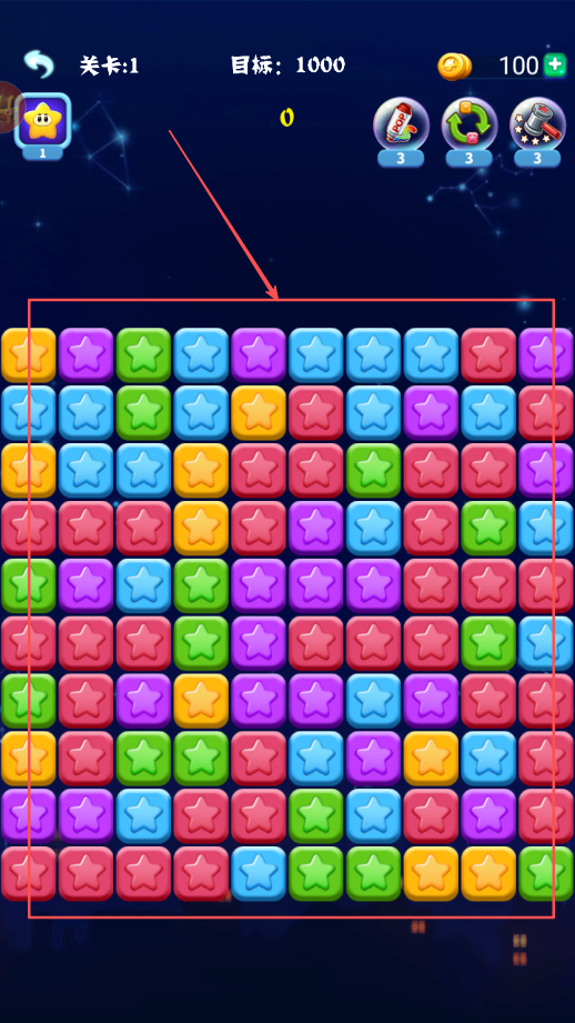 1、进入游戏选择开始挑战准备进行星星消除体验过程,熟悉操作界面和基本功能布局设计特点。