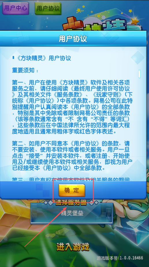 1、打开后会看到游戏协议,点一下同意,不然没法继续往下用游戏的功能哦。