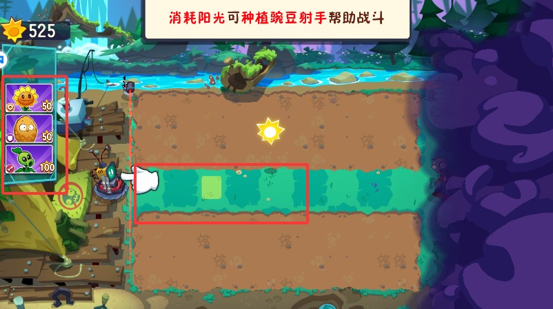 3、消耗积累的阳光在草坪格子上部署豌豆射手等植物,组建多层次防御体系。